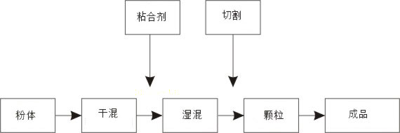 物料與粘合劑在圓筒形容器中由底部混合漿充分混合成濕潤軟材,然后由側(cè)置的高速粉碎漿切割成均勻的濕顆粒。