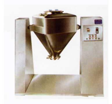 料裝入方錐形密閉混合桶內,混合桶對稱的軸線與回轉軸線成一夾角,不同組物料在密閉的混合桶中進行三維空間運動,產(chǎn)生強烈翻轉和擴散收縮作用,達到良好的混合效果。