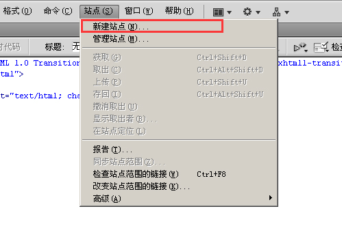 新建HTML之后,我們找到菜單里“站點(diǎn)”一欄,點(diǎn)擊之后,下拉菜單出現(xiàn)“新建站點(diǎn)”和“管理站點(diǎn)”,如下圖所示: