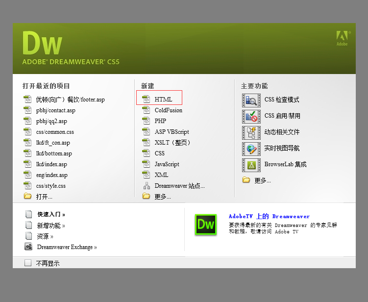 css文件夾是放后綴名為.css的文件,images文件夾是放網(wǎng)站所有用到的圖片,js文件夾是放所有網(wǎng)站用到的后綴名為.js的文件 dw怎么新建站點(diǎn)? 首先,我們打開DW軟件,出現(xiàn)如下窗口,我們點(diǎn)擊“新建-HTML