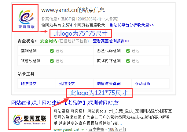 a.LOGO提交尺寸:PC/移動站可提交121*75、75*75、84*52三種尺寸的圖片。其中121*75尺寸的LOGO用于PC檢索時候展現(xiàn)在TITLE下方、75*75尺寸的LOGO用于使用SITE命令的時候展現(xiàn)、而84*52尺寸的LOGO則主要是自適應(yīng)站、具有獨立移動站等網(wǎng)站在移動端展示的。